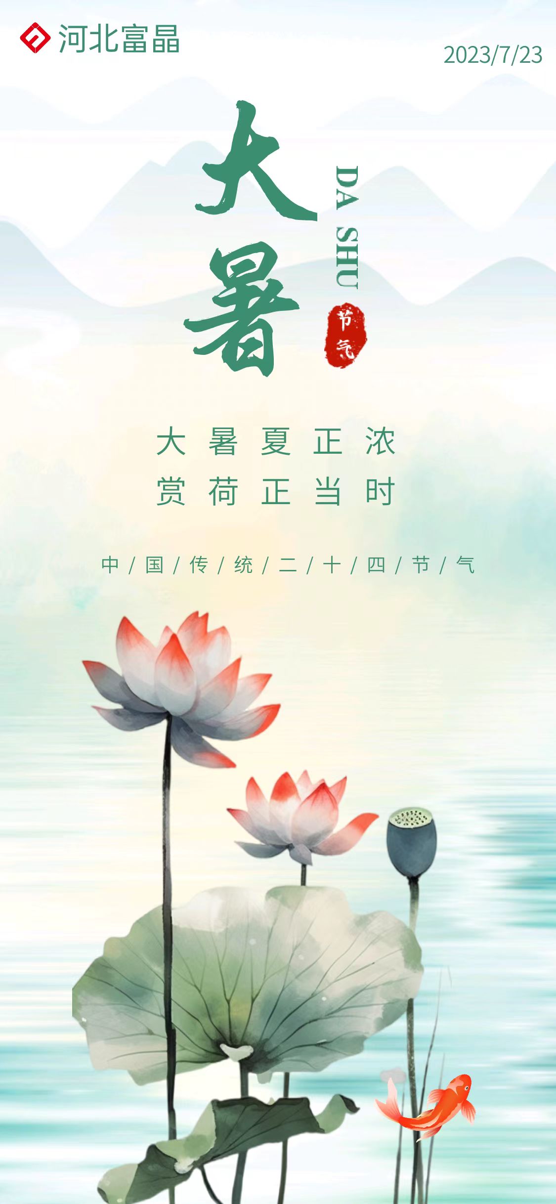 今天是7月23日星期日,也是大暑节气,愿你迎夏而绽,自带光芒,往后的日子里,眼中有美景,心中有清凉,快乐“暑”不尽,好运“暑”不完,河北富晶祝您清凉一夏,百事可乐!
